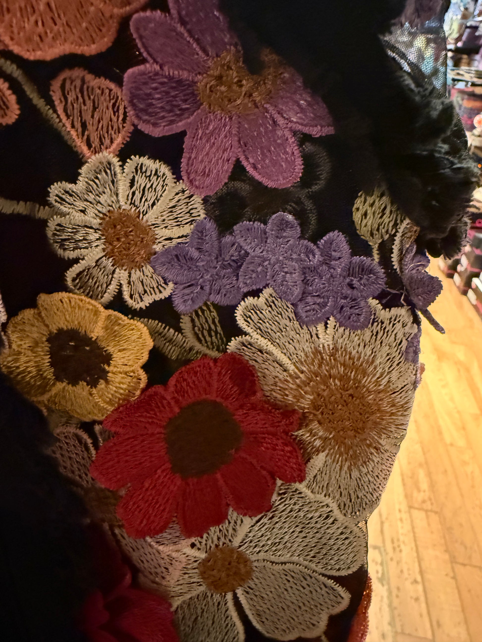 This is a chic Jean jacket with distressed look. Sheer sleeves with colorful 3 D embroidery flower appliqués sewn throughout the jacket & sleeves, making it a unique blend of distressed denim & feminine elegance.